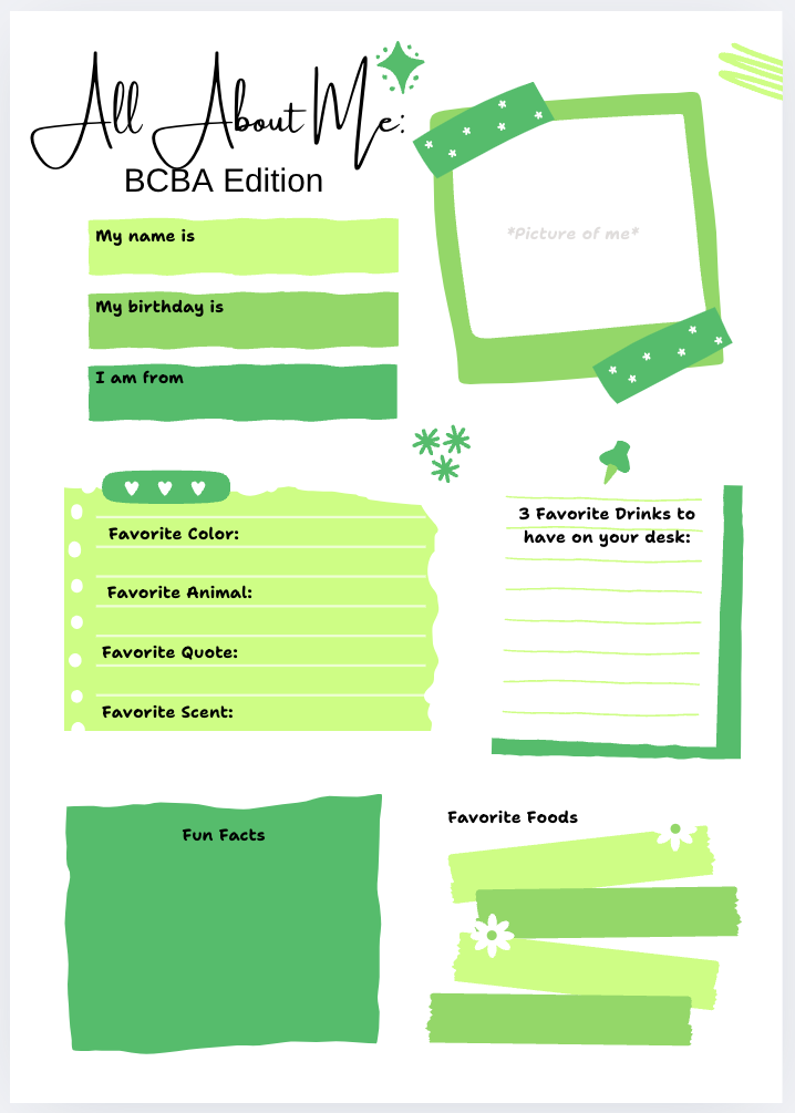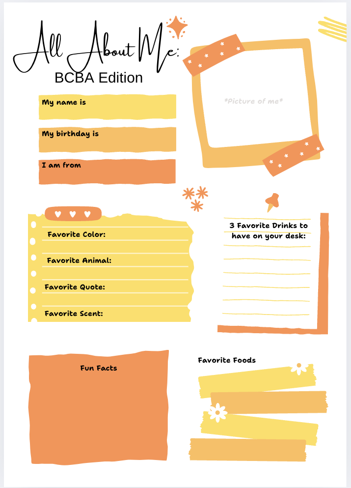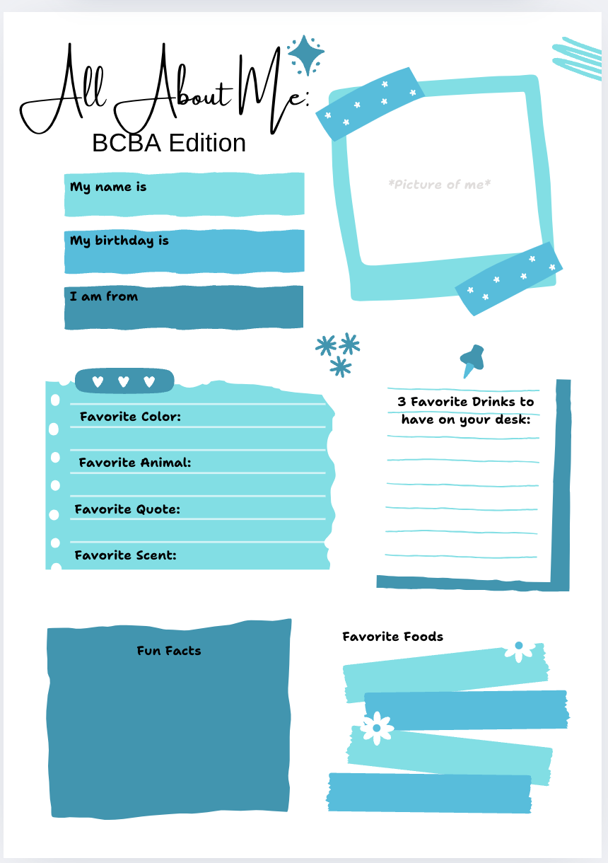 Get to know your BCBA in a fun and engaging way with our “All About Me: BCBA Edition” digital download! This PDF is designed to help BCBAs build stronger personal connections through shared fun facts and preferences. Perfect for introducing yourself or your BCBA to new colleagues, this resource includes space for basic personal details, including their name, birthday along with their favorite food, drink, scent, color, and more!