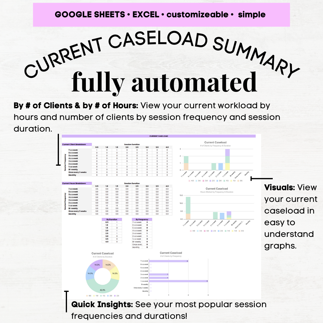 With automated breakdowns of your caseload by frequency, duration, and activity, plus real-time availability tracking, this planner ensures you’re always aware of how many additional clients you can take on.