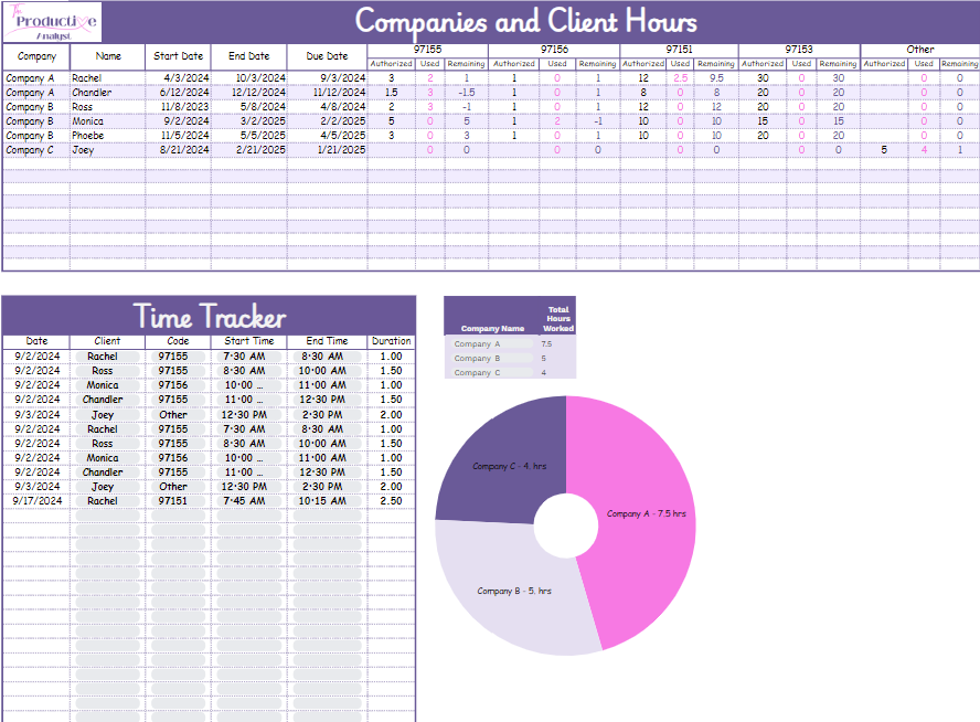 Manage your work hours like a pro! This easy-to-use Time Tracking Spreadsheet is designed to help therapists, freelancers, and consultants track their hours across multiple clients and companies with ease. Whether you’re juggling multiple projects, different work codes, or just want an organized way to manage your time, this Google Sheets template will save you hours of admin work and help you stay on top of your schedule.