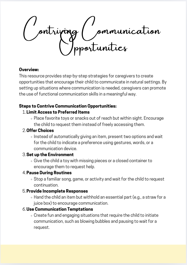 Empower caregivers with evidence-based strategies to increase functional communication in daily routines with the Contriving Communication Opportunities guide. This digital downloadable resource is designed for BCBAs, RBTs, and ABA professionals to use during parent training sessions, helping caregivers create natural opportunities for their child to express wants and needs.