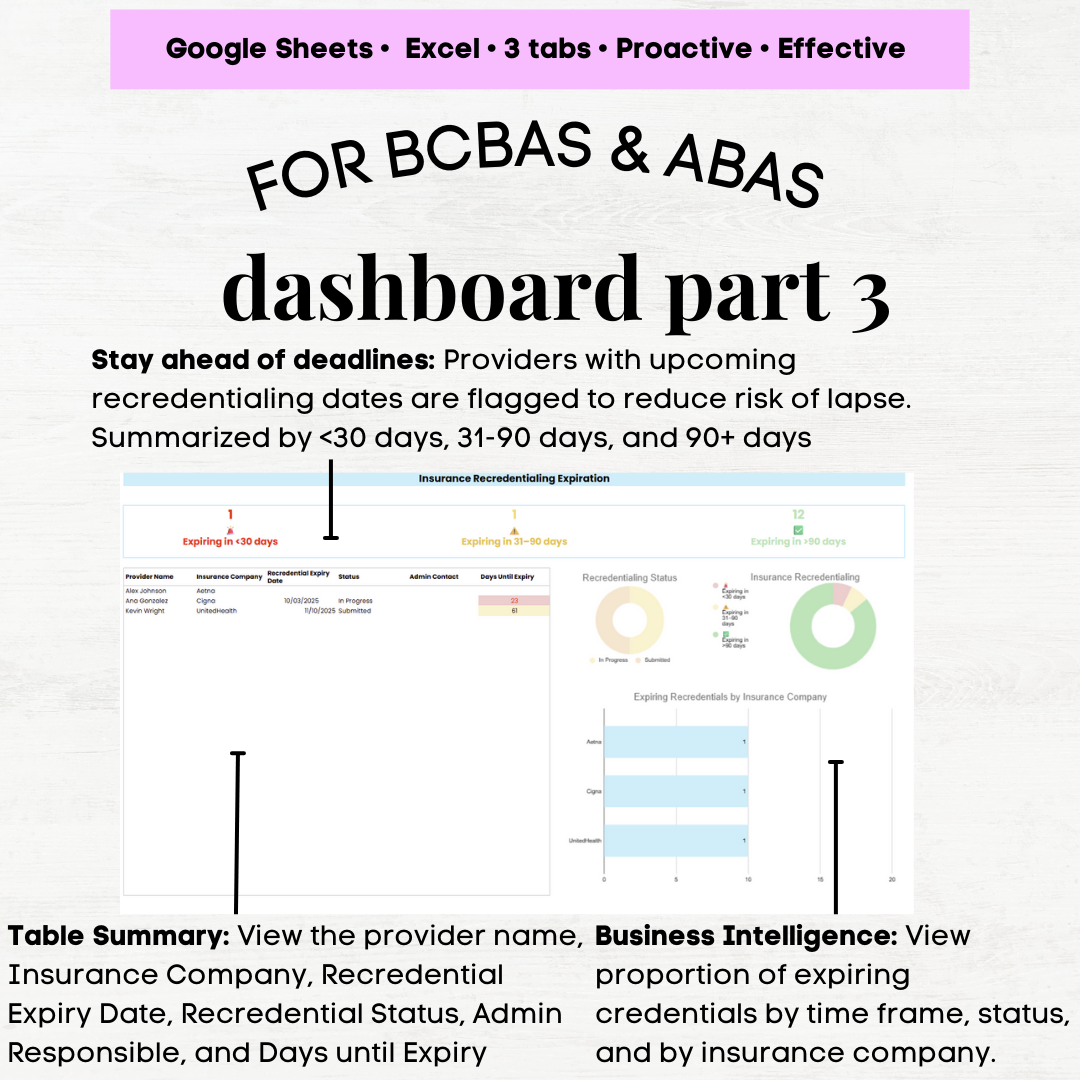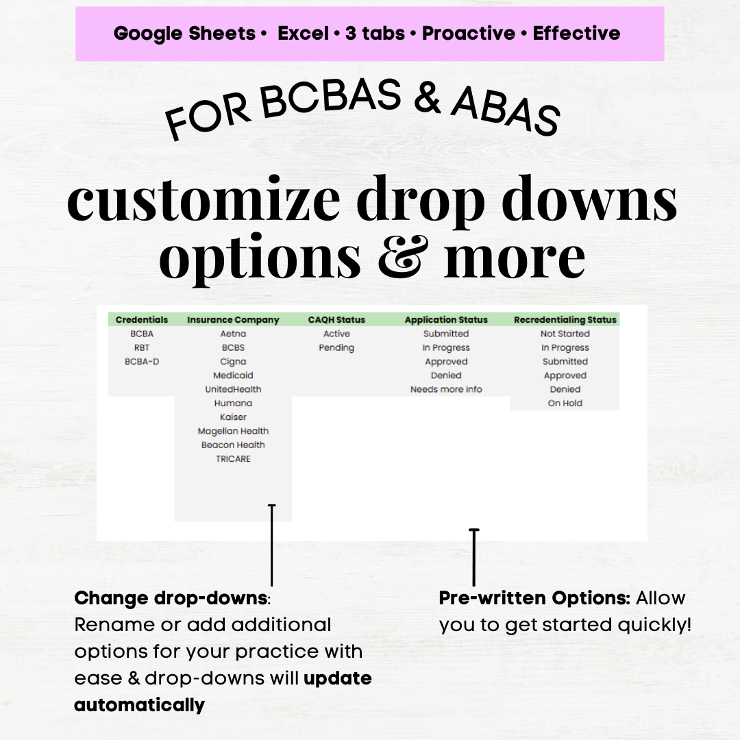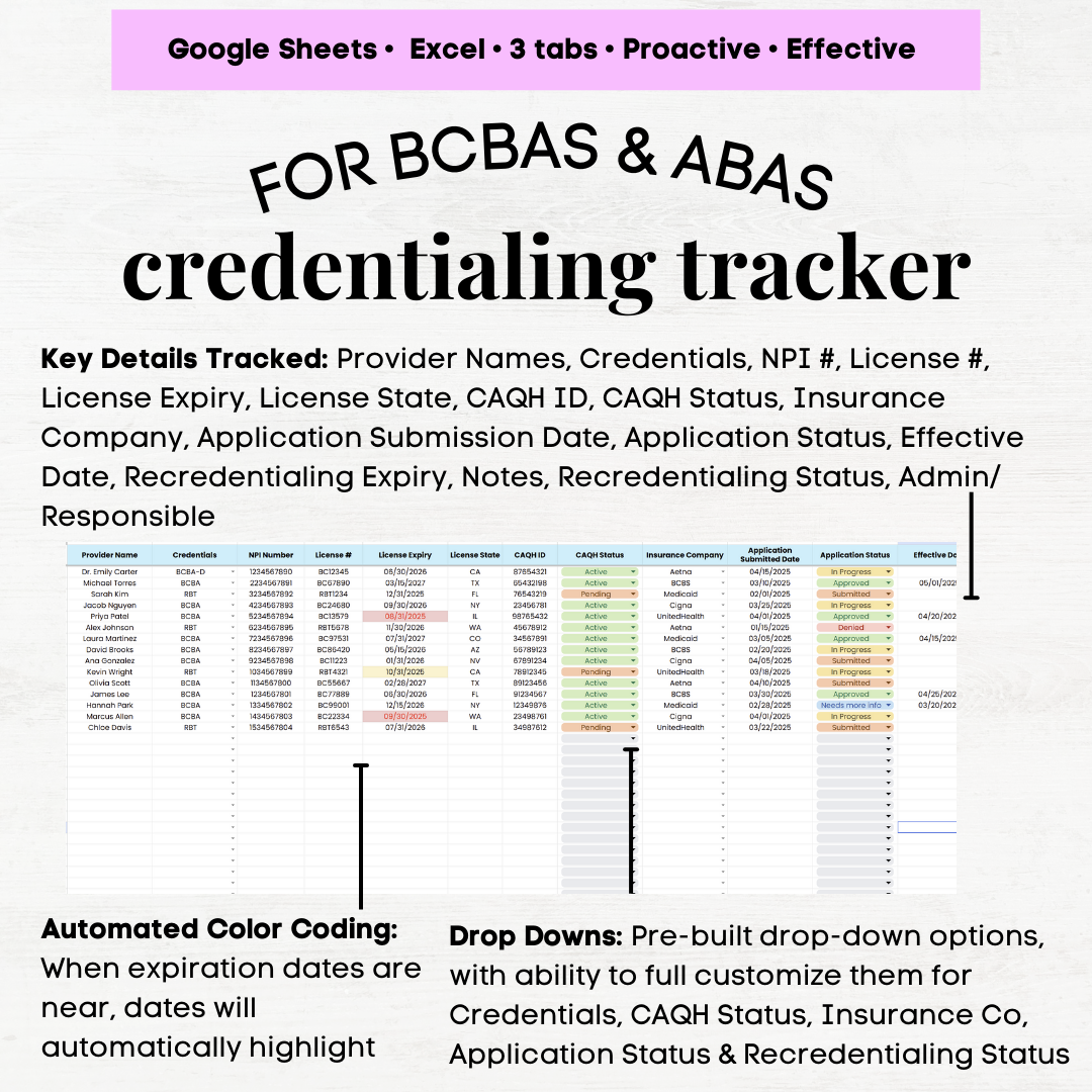 Stay organized with this credentialing tracking spreadsheet template for ABA clinics and the BCBA credentialing process. This easy-to-use credentialing spreadsheet tracks provider licenses, insurance applications, CAQH, and recredentialing deadlines. Perfect for clinics needing a credentialing tracking template to simplify and streamline credentialing BCBA providers.