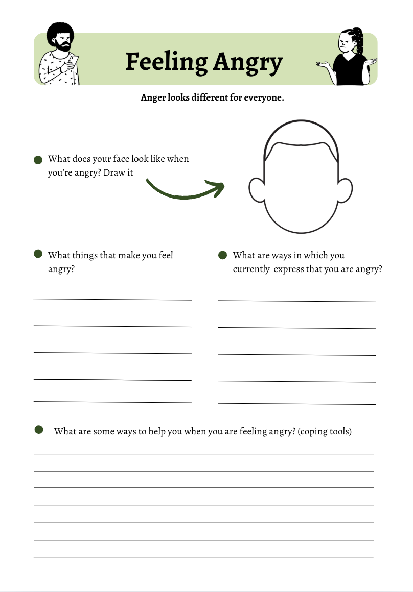 Kid-friendly worksheets for identifying and expressing emotions (angry, sad, worried, happy)