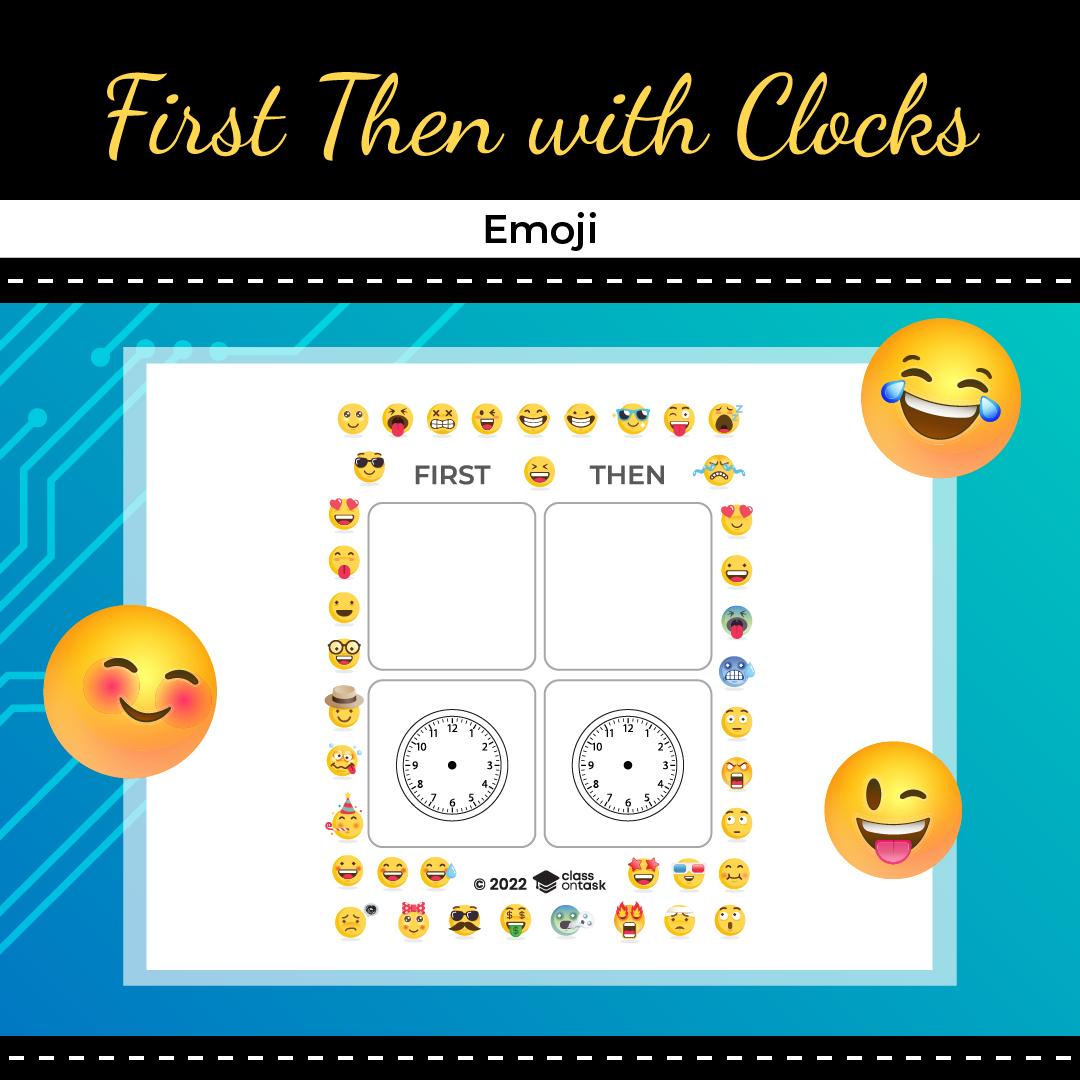 First, Then Board with Clocks – Emoji Theme