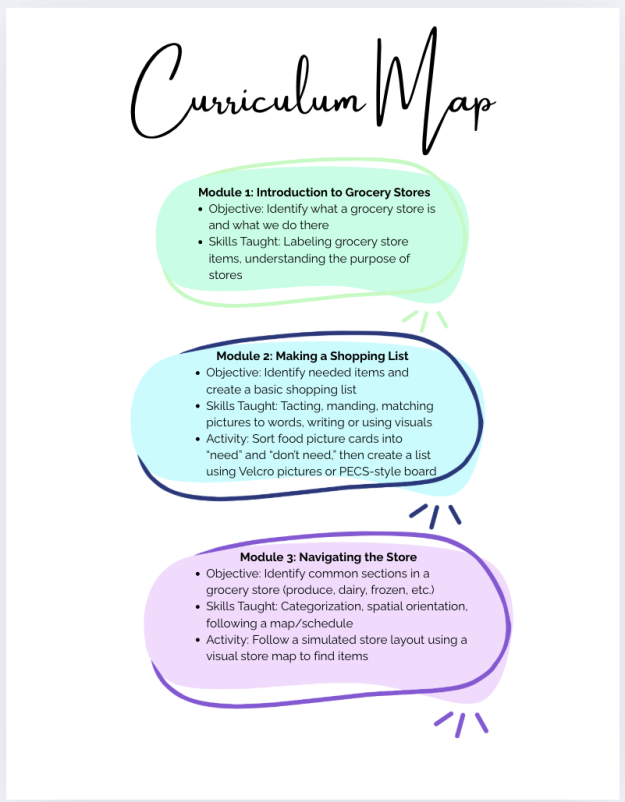 Each module is designed to target functional communication, social interactions, money handling, safety skills, coping with unexpected changes, and more — ensuring learners gain real-world readiness for navigating a grocery store.