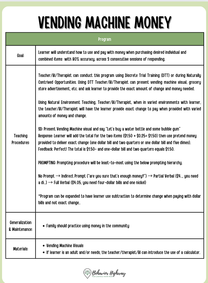 Empower learners to handle money transactions confidently with our comprehensive ABA program focused on independent money skills. This digital download is ideal for educators, therapists, and parents seeking to teach essential skills for counting money, determining totals, and calculating change. The program includes a detailed instruction sheet and a vending machine visual to make learning engaging and practical.
