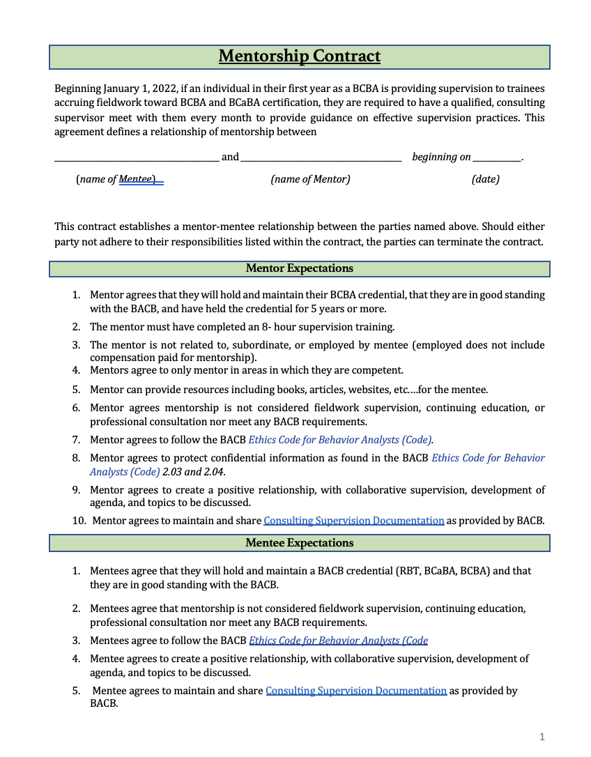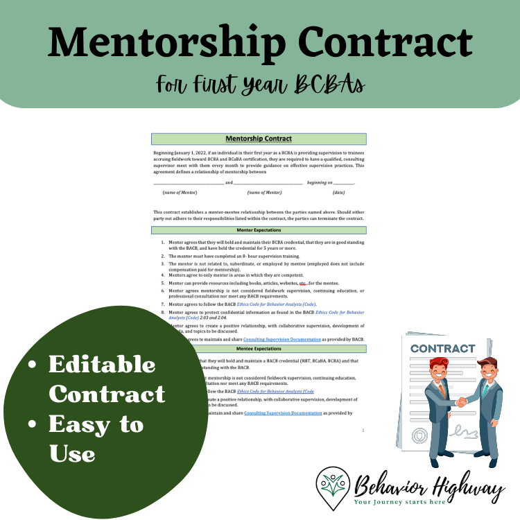 Ensure compliance with the latest BACB requirements and foster a supportive mentorship relationship with our comprehensive Mentorship Contract. Beginning January 1, 2022, new BCBAs providing supervision to trainees accruing fieldwork toward BCBA and BCaBA certification must engage with a qualified, consulting supervisor monthly. This digital download defines the mentorship relationship, providing a clear and structured agreement to guide effective supervision practices.
