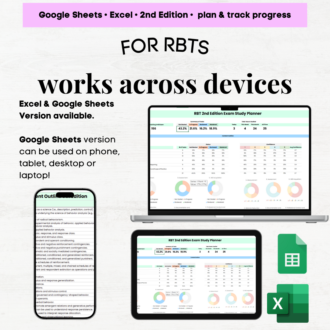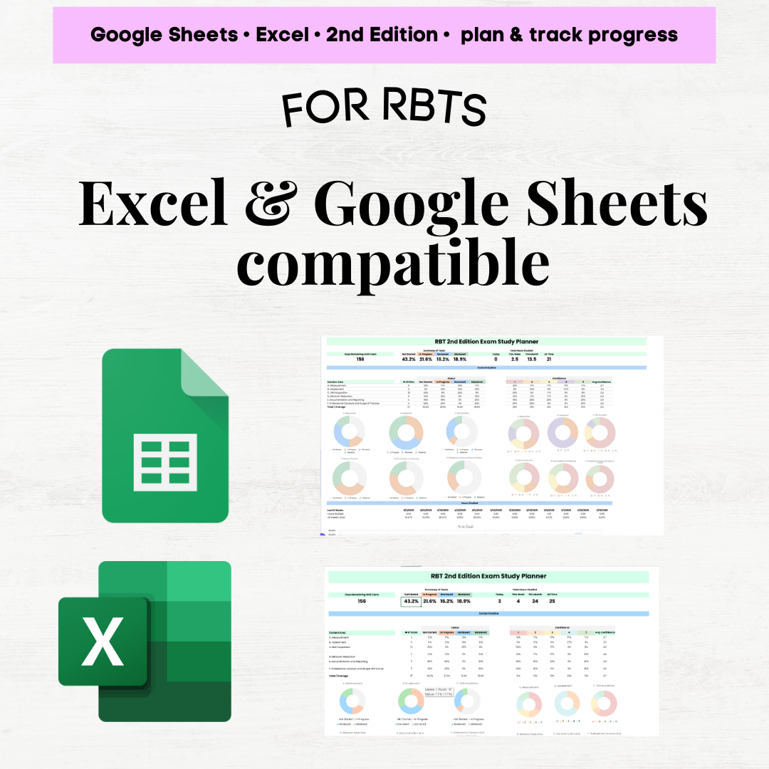 Stay organized and on track for your RBT exam! This dynamic planner includes a Task List tracker, automated Last Reviewed Dates, study session logs, a smart calendar, and visual dashboards. Perfect for tracking confidence, study hours, and progress. Fully editable for Excel and Google Sheets!