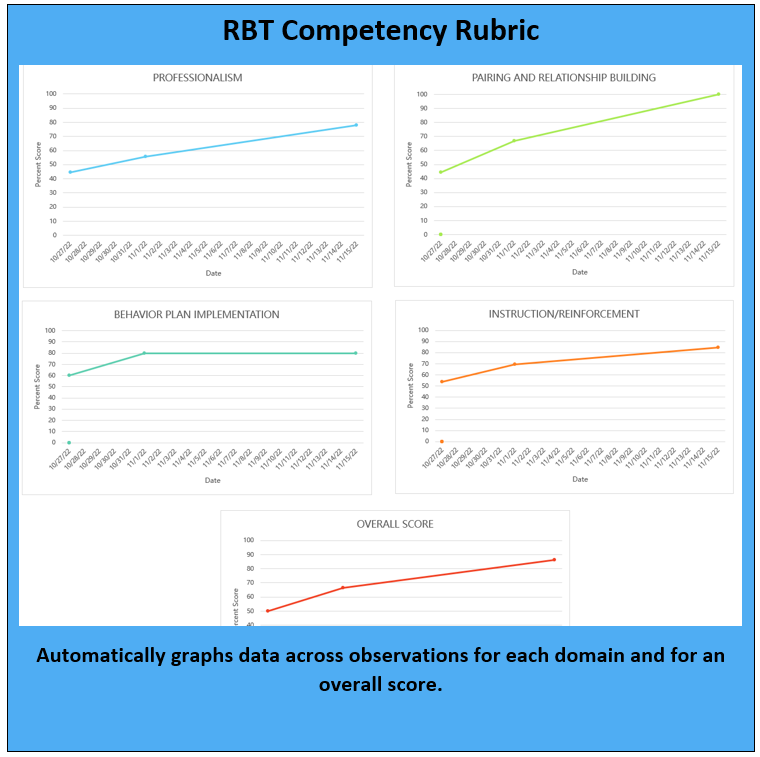 RBT Rubric with domains for Professionalism, Pairing and Relationship Building, Behavior Plan Implementation, and Instruction/Reinforcement