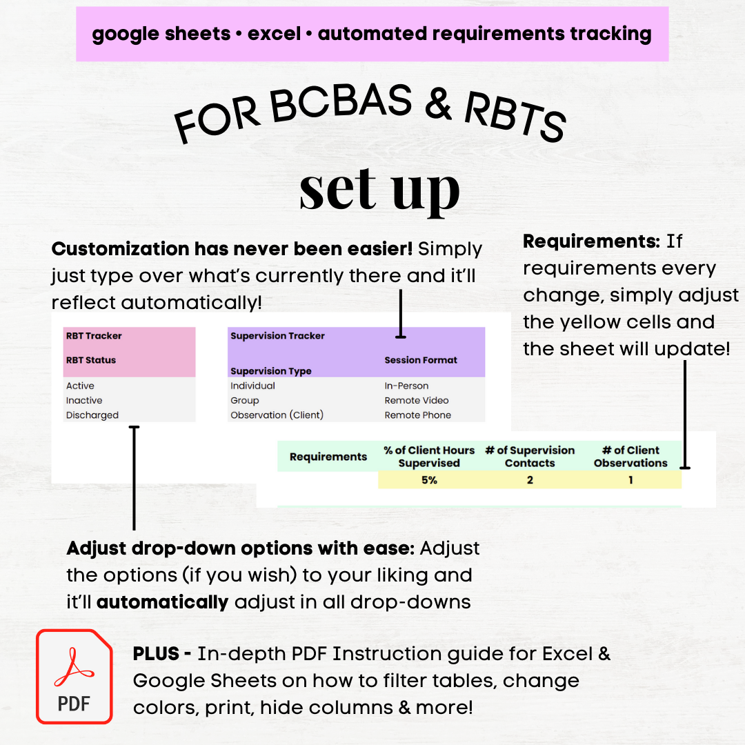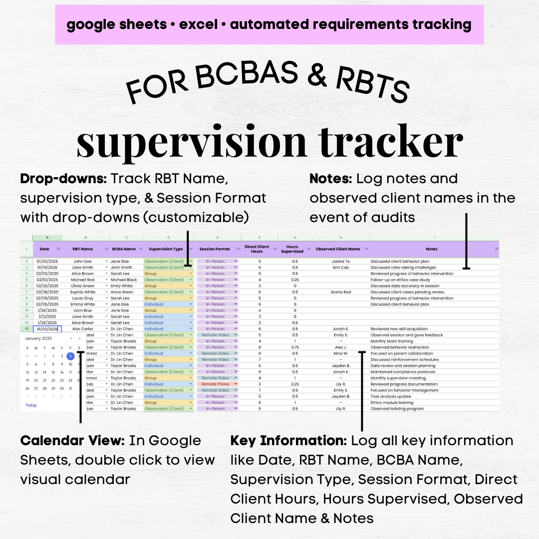 This all-in-one Supervision Tracker (available in Google Sheets and Excel) is designed specifically for RBT Managers and BCBAs to streamline the supervision process and ensure compliance with BACB supervision requirements. Whether you’re overseeing one RBT or managing an entire team, this tool helps you confidently track, calculate, and organize every hour of supervision.