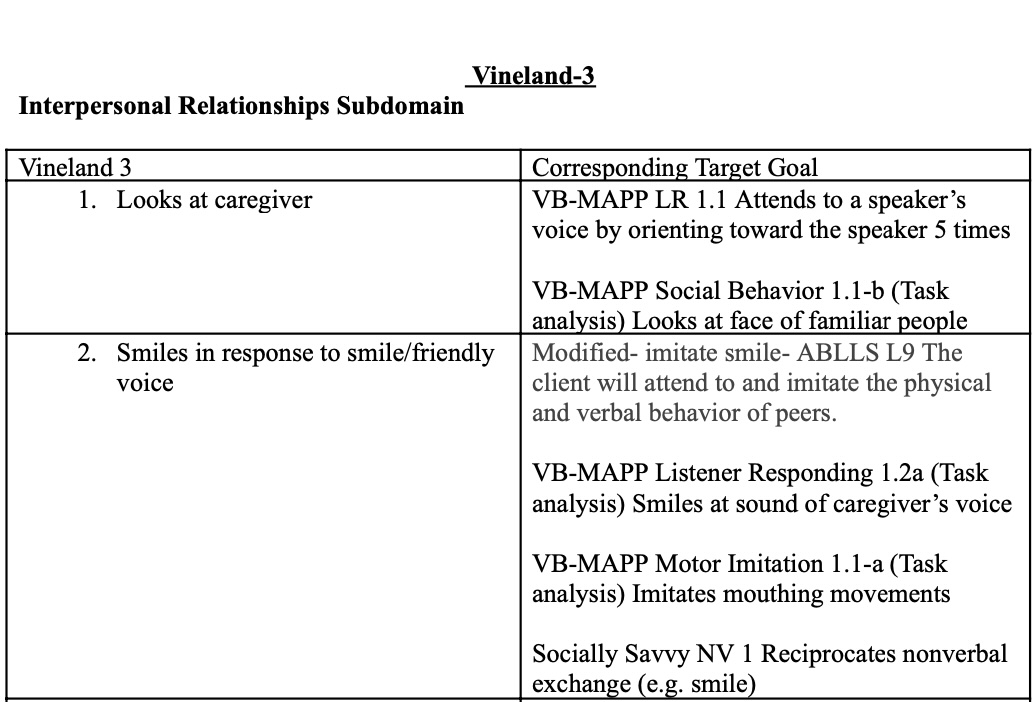 Welcome! As a trainee working towards becoming a BCBA methods of making my transition into the career easier are always on my mind. My company has recently started utilizing the results of the Vineland 3 assessment as a guide for deciding which assessment target goals to utilize for programming in the initial authorization report. Thus, this table was created to provide a reference for potential goals to use without spending a laborious amount of time having to locate goals individually for each assessment. I worked hard to make sure that most of the goals directly correspond with the Vineland goals; however, some of the corresponding goals are only related. Some goals may need to be modified which is noted in the table. I provide abbreviated phrases of the goals.